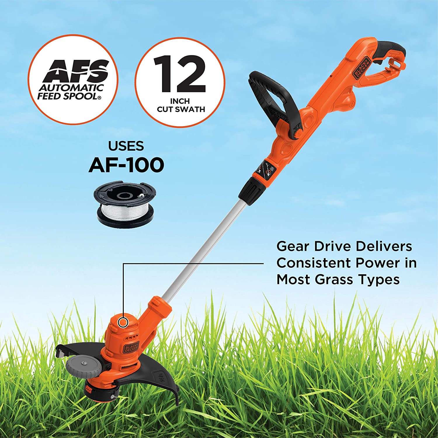 - Automatic Feed Spool (AFS) lets you continue working without bumping or having to stop to adjust the Spool. Cutting heights 1. 6 inches. /2. 4 inches. Cutting path 12 inch